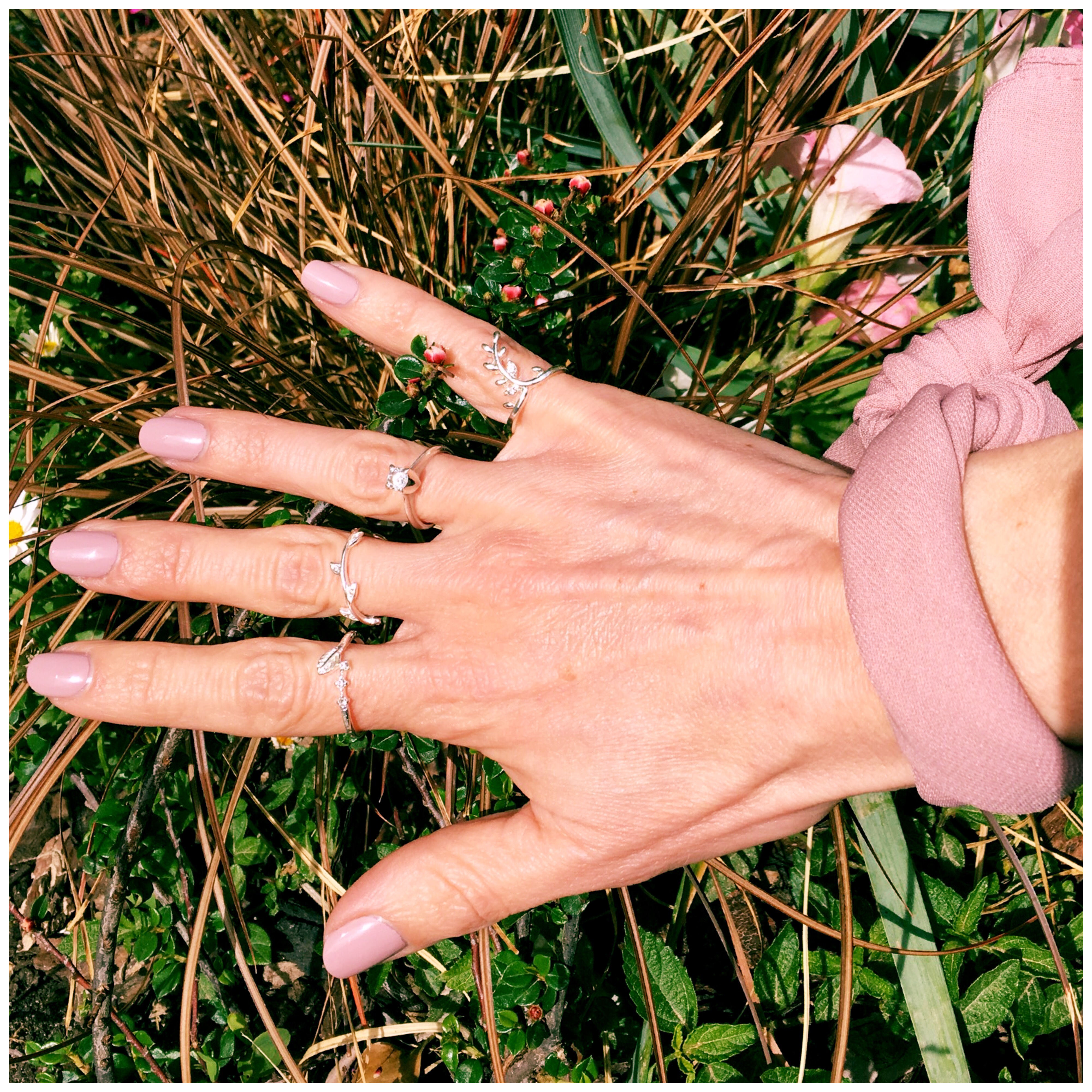 ESSIE Go Go Geisha, anillos con detalles florales de H&M y pañuelo de SFERA ACCESSORIES