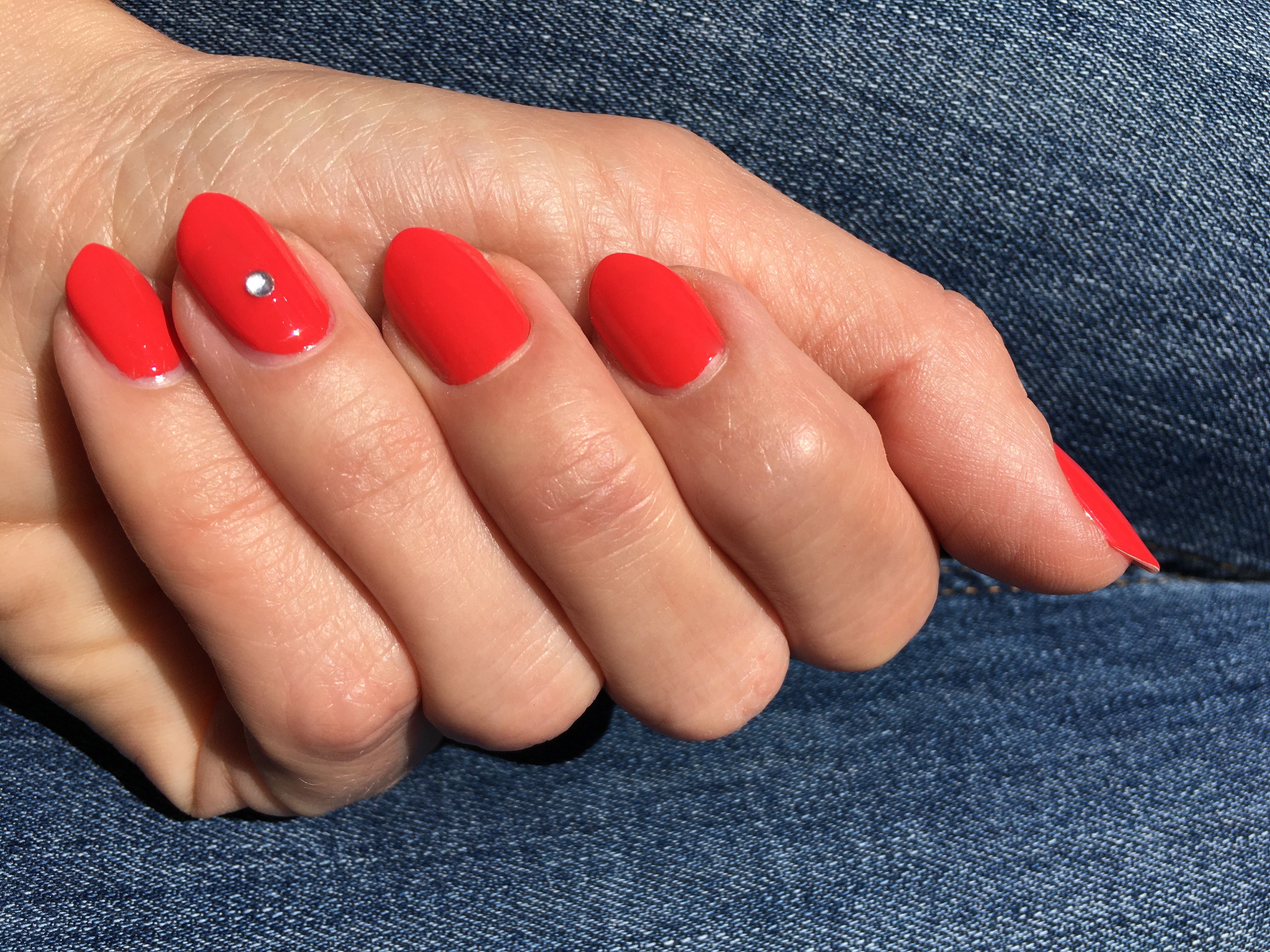 Vaya rojo precioso y ese detalle brillante que me encanta. Una manicura que anima el día y la semana entera