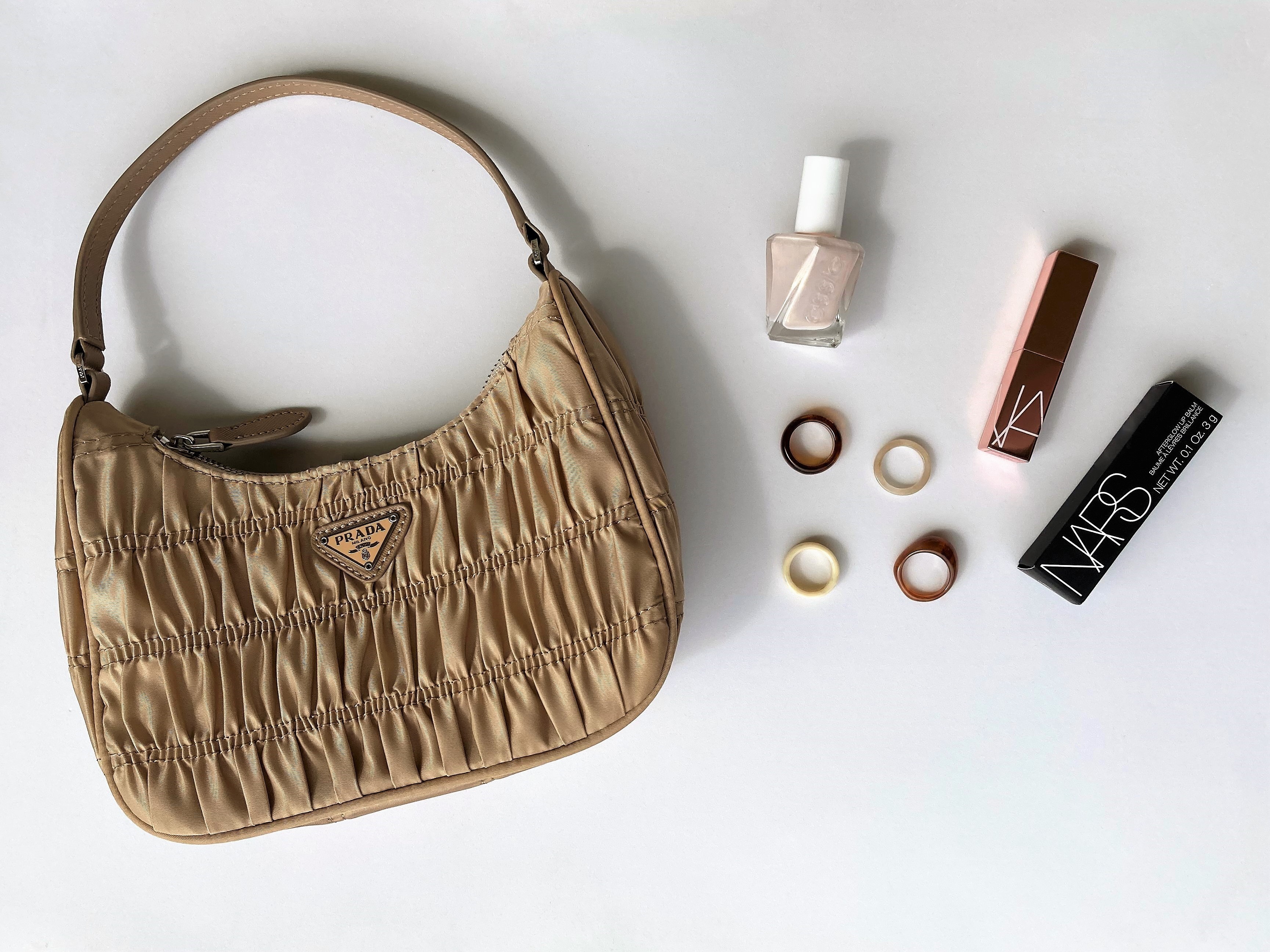 Wherever you are headed this summer, make sure you take a small nylon handbag with you to give a vintage feel to your outfits. Nylon bags were a huge trend in the early 2000’s and this season they are back in the scene thanks to PRADA recent re-editions of their iconic nylon handbags. This hobo re-edition in ruched beige nylon is equal parts functional and chic, the perfect small size bag to carry your essentials in style. Versatile and feminine, there are endless ways to incorporate this awe-inspiring piece to your warm weather oufits.
